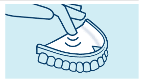 DICA: Para remover a almofada de dentadura, levanta um canto e puxa a almofada. Ao contrário dos cremes para dentaduras, que podem deixar resíduos e requerem uma escovagem demorada, as almofadas Algasiv são fáceis de remover. Graças à facilidade de limpeza de Algasiv, podes colocar a prótese na água imediatamente.