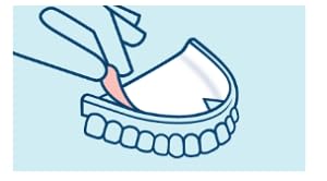 Colocar a almofadinha Algasiv sobre a prótese dentária limpa. Se for necessário, recortar com uma tesoura para adequar à forma da prótese. Colocar a almofadinha Algasiv com o lado rosa sobre a prótese dentária. Humedecer ligeiramente com os dedos. Colocar a prótese dentária na boca e pressionar firmemente durante 5 segundos. |
