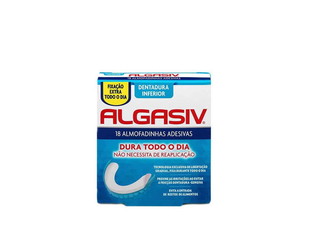 As almofadas dentárias adesivas Algasiv, ativam-se e aumentam com a saliva, proporcionando estabilidade à prótese dentária durante todo o dia.